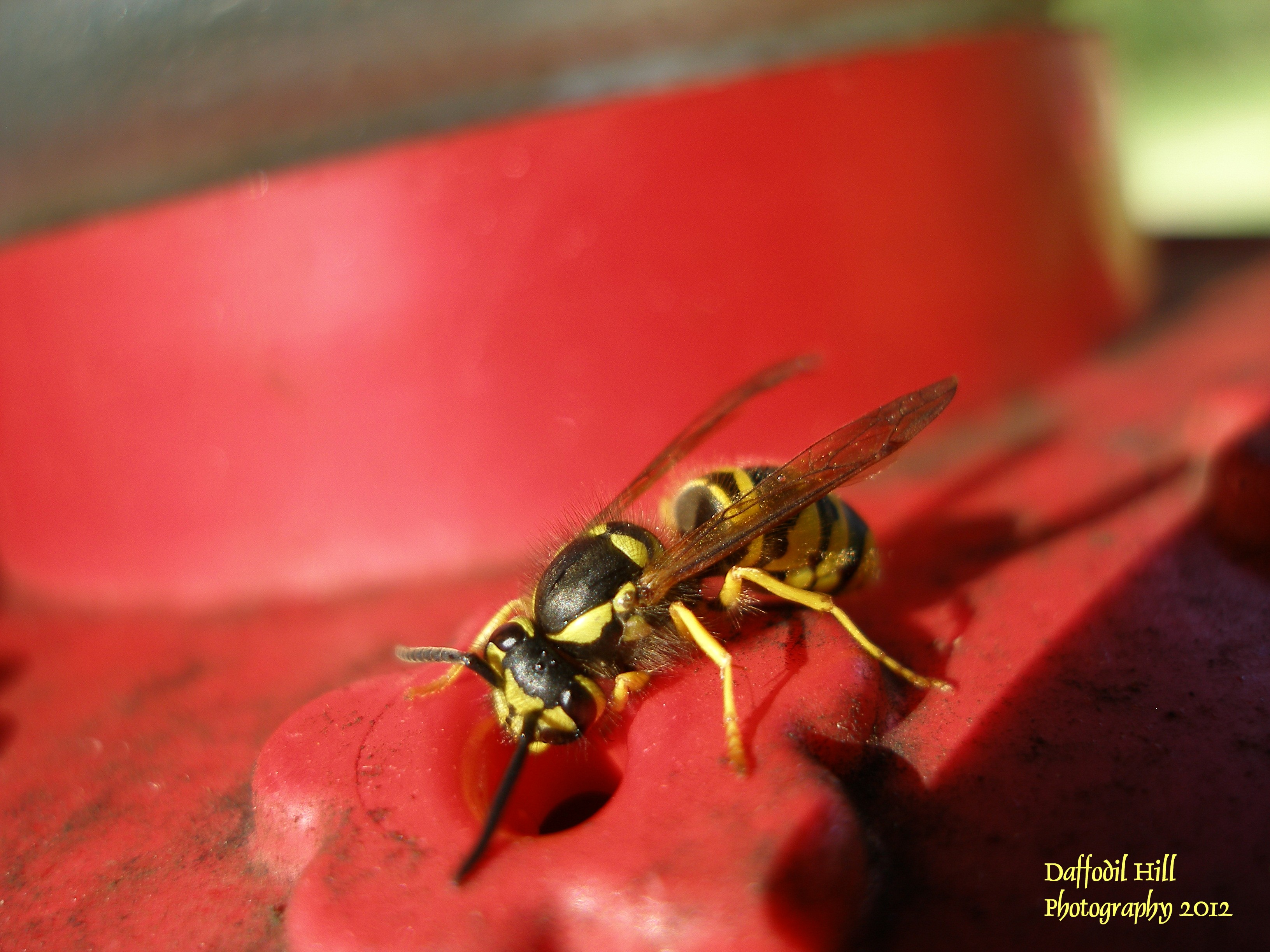 Last month, after the Hummingbirds had filed their southbound flight plans, the bees decided to take advantage of the last bit of sugary nectar in the feeder. I took this with my Olympus SP-350 and it was interesting getting these close-ups.