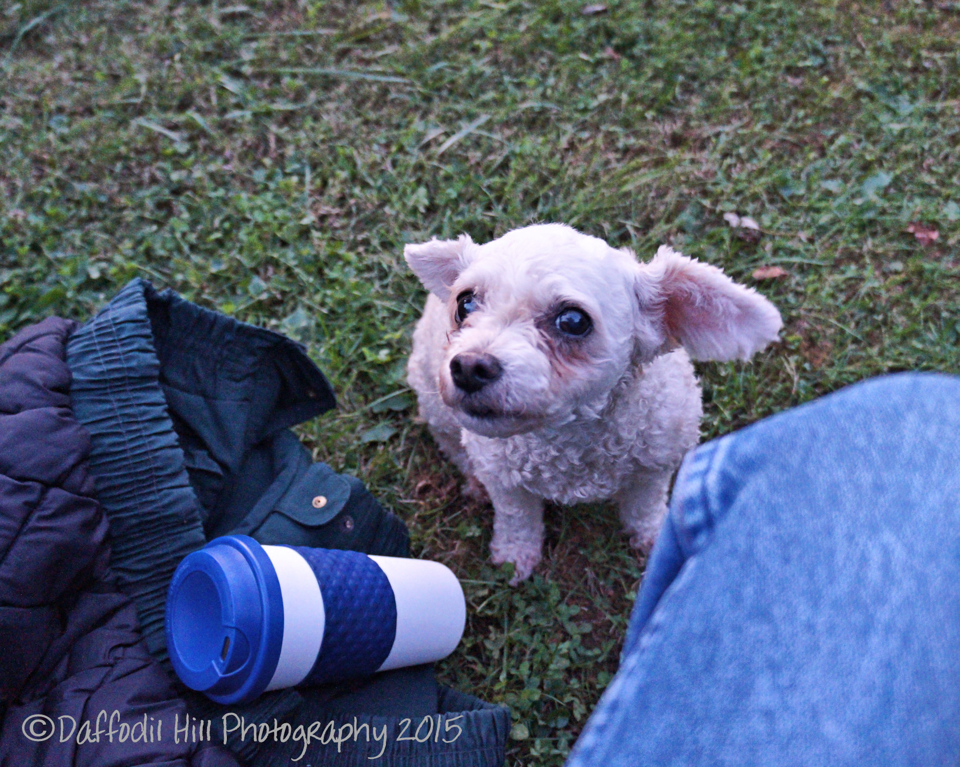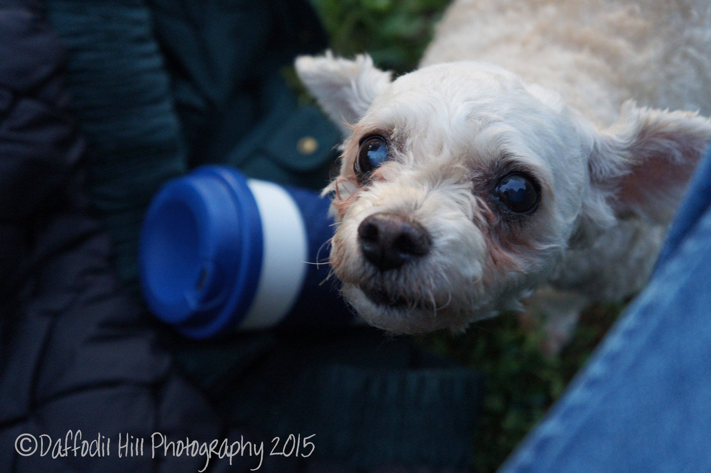 This little Lady is part of the family that put on Saturdays house concert. As you can see she has cataracts and is of mature age but is a cutie none the less. The first photo she comes over and is wondering if I have anything good on my plate. The second is after I assure there is and give her some of my chicken leg. Were friends now.