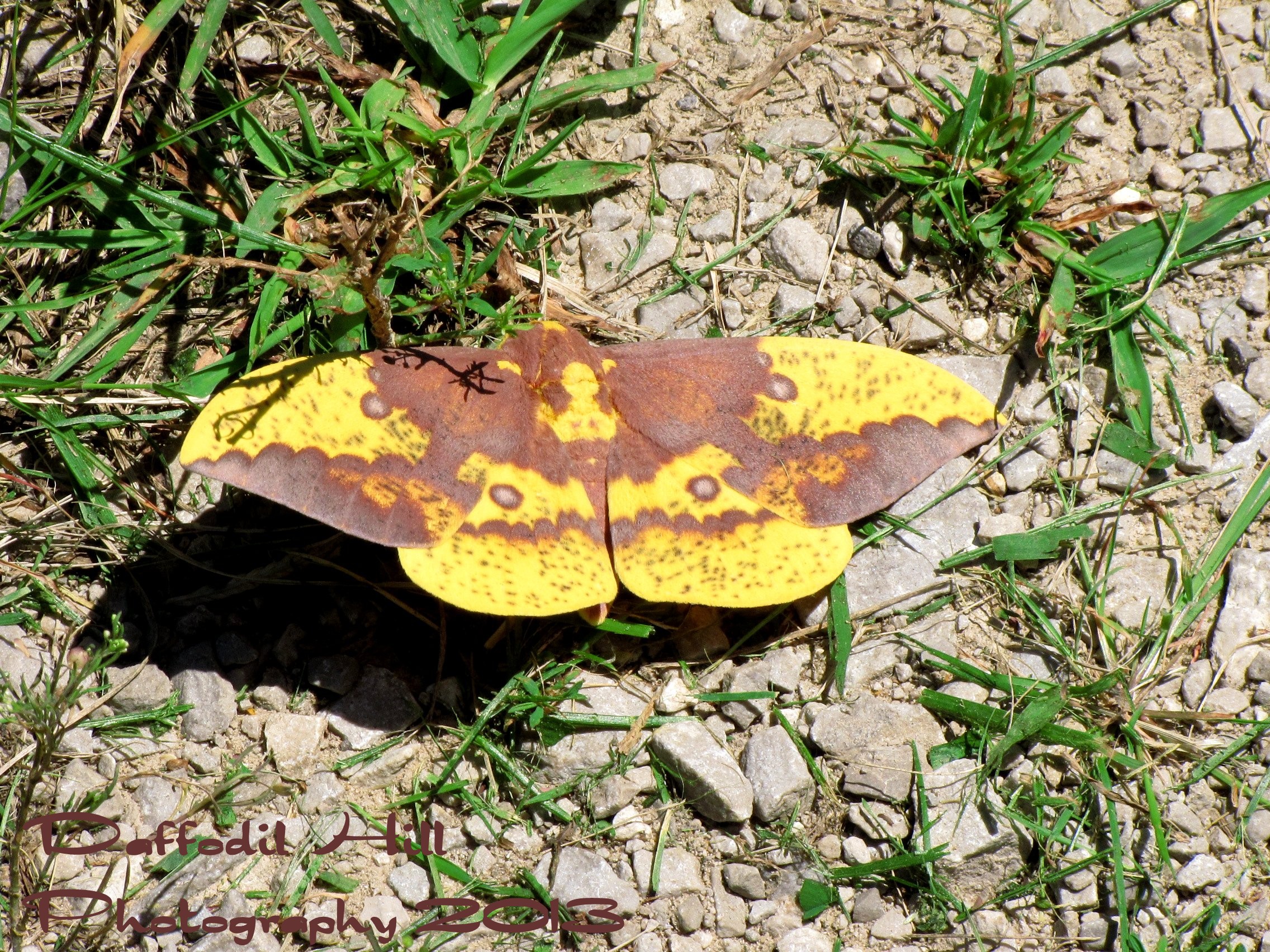 I was mowing today and almost ran over this impressive moth. Since I am unfamiliar with most moths I looked it up and discovered it is an Imperial Moth. Follow the link to read more about this impressive Moth.